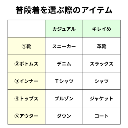 持っているアイテムの素材や色、形を見ていくと圧倒的にカジュアル比率が高くないでしょうか?