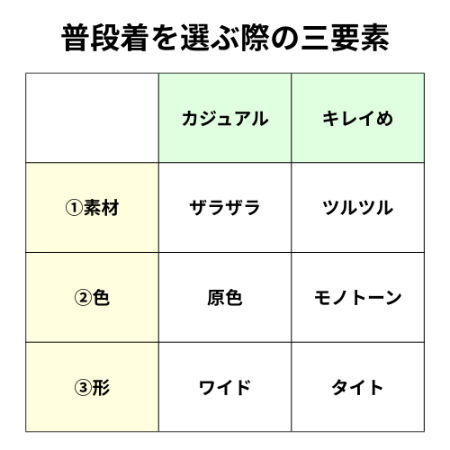 持っているアイテムの素材や色、形を見ていくと圧倒的にカジュアル比率が高くないでしょうか?